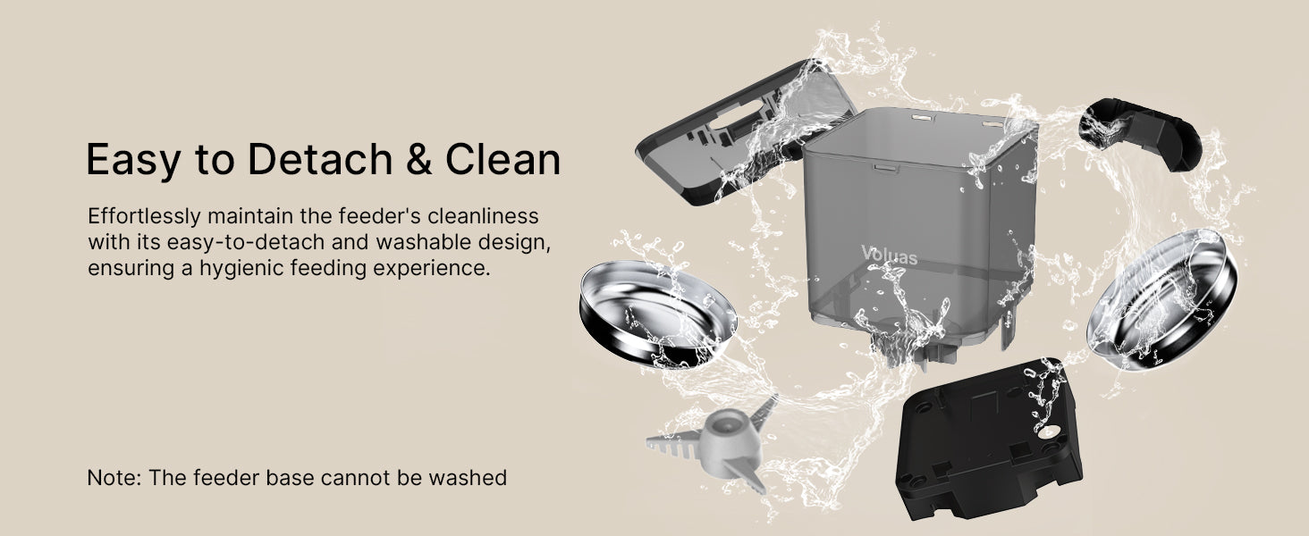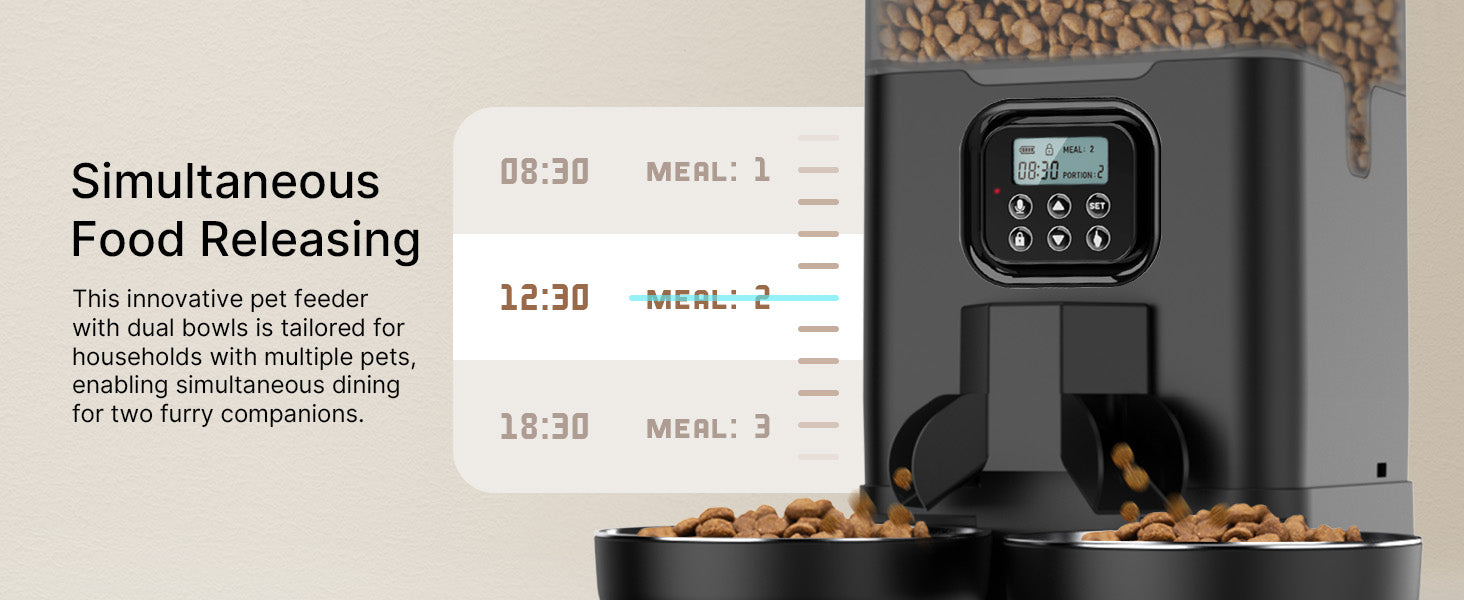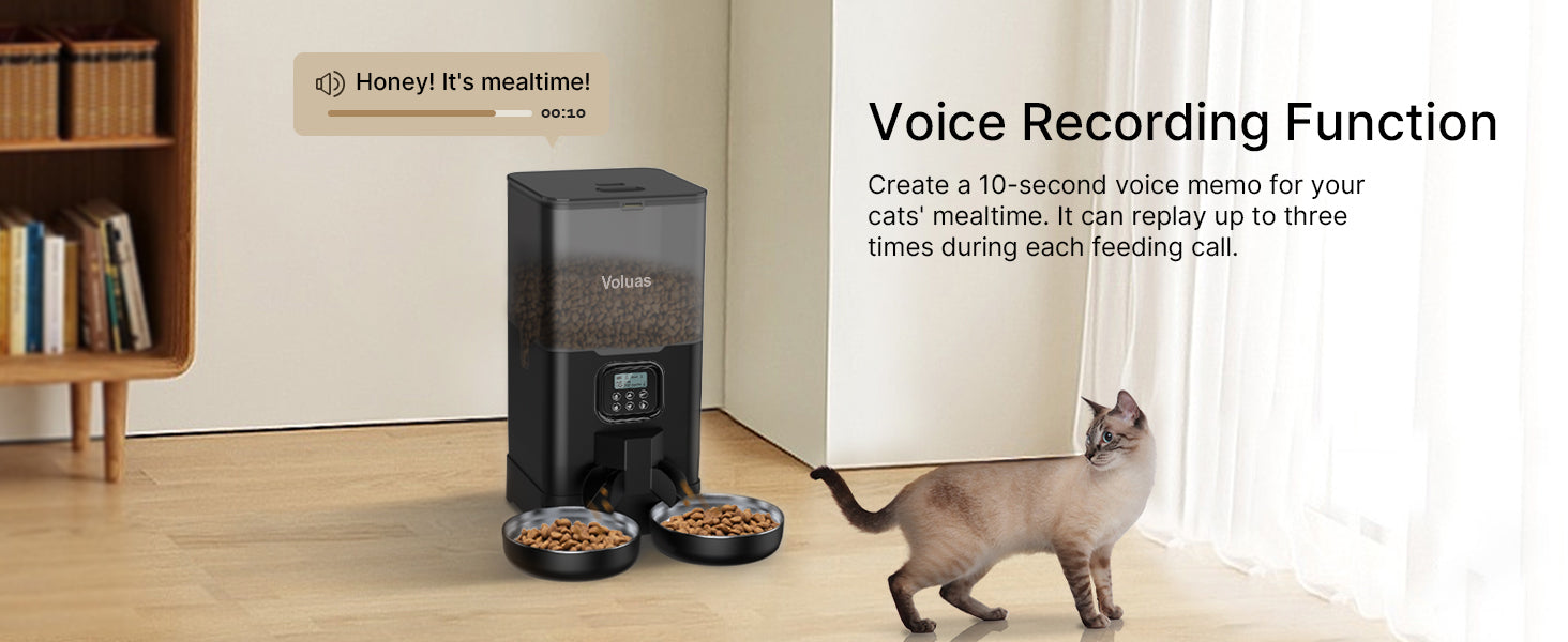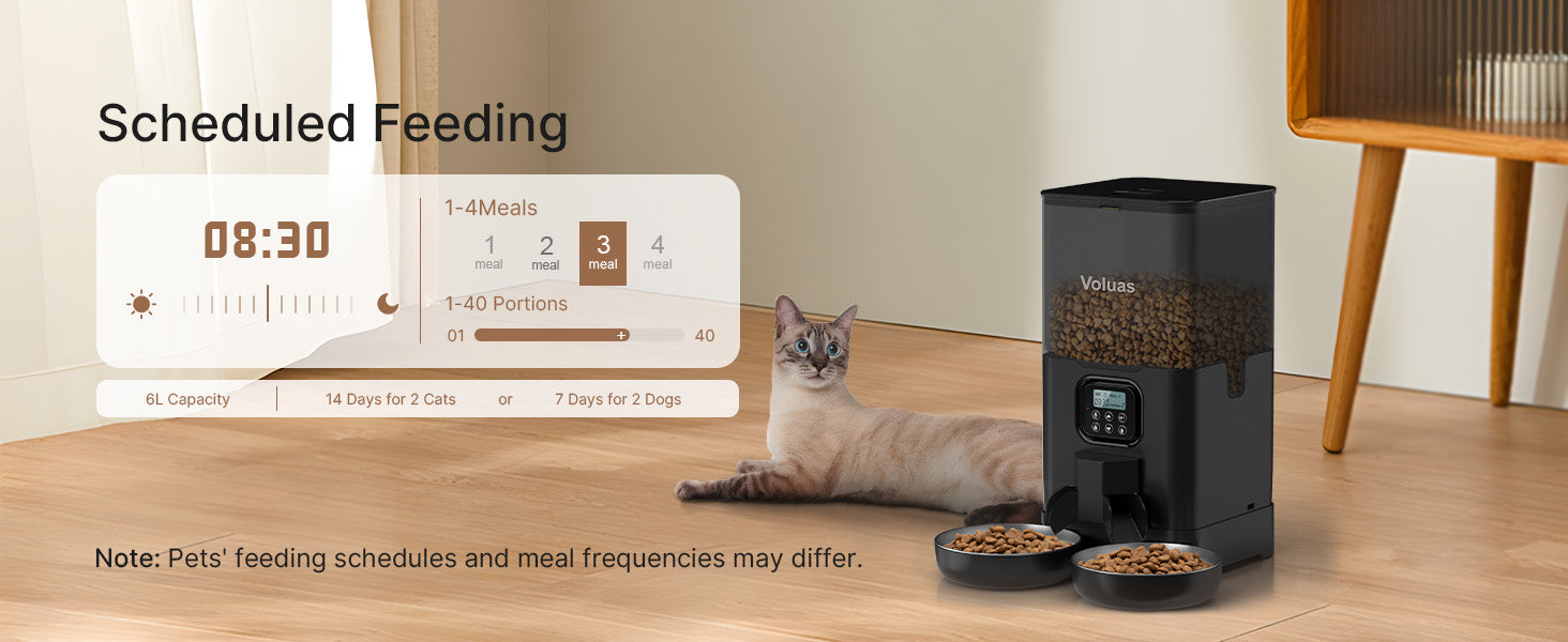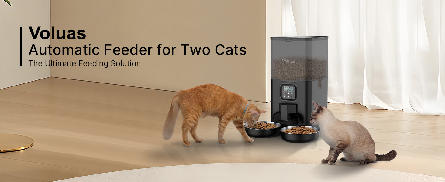 - The Optimal Choice: If your cat has learned the place where you keep the kibbles and treats, with the Voluas dry food dispenser, your little thief will never indulge as it pleases in the cat food! This double cat feeder is completely automatic and dispenses food at scheduled times, supporting a balanced and healthy diet for your cats.