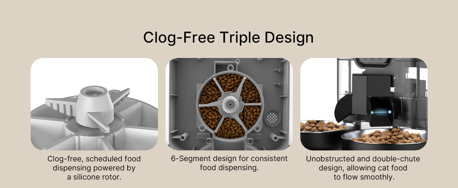 - Safe and Reliable Cat Feeder: This cat food dispenser automatic is pet-proof, featuring a locked top cover and a screen security lock to make sure your pets won’t get their food until the scheduled time. Also, the feeder has an anti-clogging system to make sure the food is delivered without any inconvenience.