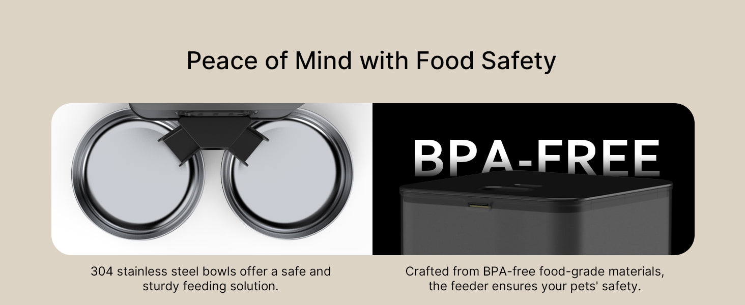- Designed for Two Cats: Our kibble dispenser features a double design equipped with a meal divider, 2 stainless steel bowls and holders. The feeder dispenses food in the 2 bowls at the same time, saving you time with food preparation while encouraging a regular meal schedule.